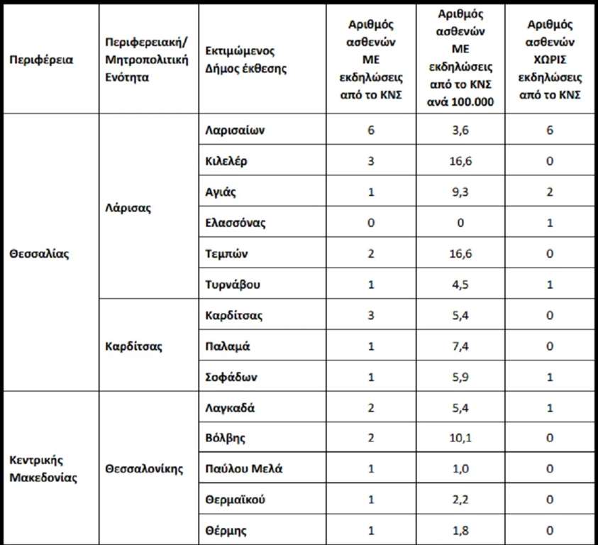Έχουν καταγραφεί, επίσης, δύο εισαγόμενα κρούσματα της λοίμωξης σε ασθενείς που εκτέθηκαν σε άλλη χώρα του εξωτερικού (δεν περιλαμβάνονται στην περαιτέρω ανάλυση). Έχουν καταγραφεί δέκα (10) θάνατοι σε ασθενείς με λοίμωξη από τον ιό, ηλικίας άνω των 60 ετών (διάμεση ηλικία θανόντων= 80 έτη, εύρος 61-92 έτη).