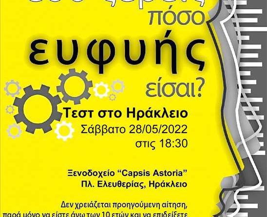 Το Σάββατο 27 Μαΐου 2022 στο Ηράκλειο, με ώρα έναρξης 18:30. Το τεστ θα διεξαχθεί στο ξενοδοχείο “Capsis Astoria”, Πλ. Ελευθερίας, Ηράκλειο.