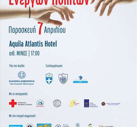 Ημερίδα με θέμα «Εθελοντισμός και Αθλητισμός – Κοινωνία Ενεργών Πολιτών», για τη συμπόρευση της αθλητικής οικογένειας και της κοινωνίας των ενεργών πολιτών, θα πραγματοποιηθεί το απόγευμα της Παρασκευής 7 Απριλίου στο Ηράκλειο (ξενοδοχείο Aquila Atlantis, αίθουσα Μίνως, 5 μ.μ.).