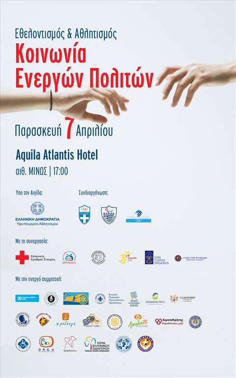 Ημερίδα με θέμα «Εθελοντισμός και Αθλητισμός – Κοινωνία Ενεργών Πολιτών», για τη συμπόρευση της αθλητικής οικογένειας και της κοινωνίας των ενεργών πολιτών, θα πραγματοποιηθεί το απόγευμα της Παρασκευής 7 Απριλίου στο Ηράκλειο (ξενοδοχείο Aquila Atlantis, αίθουσα Μίνως, 5 μ.μ.).