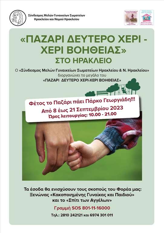Παρατείνεται έως και την Πέμπτη 21 Σεπτεμβρίου 2023 το μεγάλο ετήσιο «ΠΑΖΑΡΙ ΔΕΥΤΕΡΟ ΧΕΡΙ-ΧΕΡΙ ΒΟΗΘΕΙΑΣ» του «Συνδέσμου Μελών Γυναικείων Σωματείων Ηρακλείου και Ν. Ηρακλείου» το οποίο φιλοξενείται στο ΠΑΡΚΟ ΓΕΩΡΓΙΑΔΗ, στο Ηράκλειο και ώρες 10.00 – 21.00.