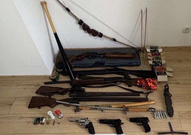 Κατά τη διάρκεια των ερευνών βρέθηκαν και κατασχέθηκαν μεταξύ άλλων περίστροφο κρότου λάμψης με γεμιστήρα, δυο αεροβόλα πιστόλια, πέντε κυνηγετικά όπλα, τόξο με βέλη, σπάθη, ξιφολόγχη, ρόπαλο, αναδιπλούμενο μαχαίρι, κάλυκες, αλλά και κροτίδες, αμπούλες αερίου, μεταλλικά σφαιρίδια αεροβόλου όπλου και 260 φυσίγγια.