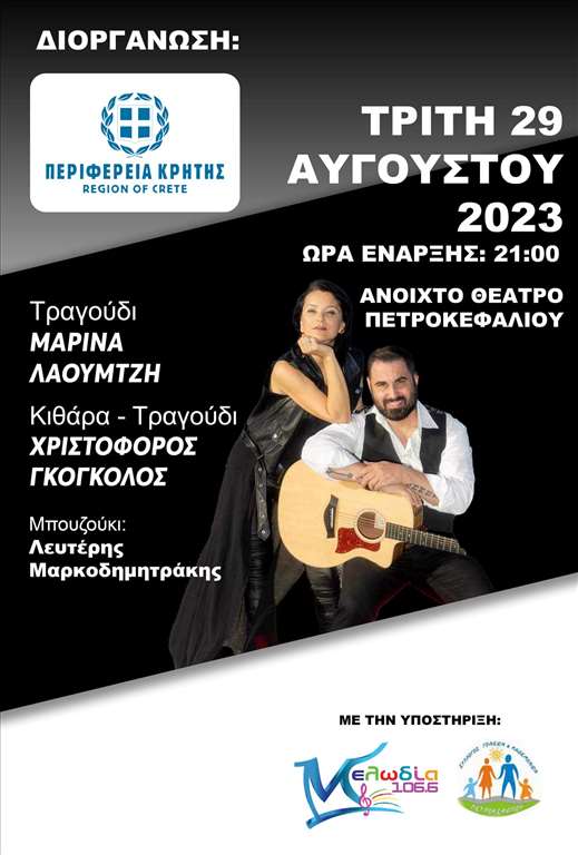 Την Τρίτη 29 Αυγούστου 2023 και ώρα 21.00 στο Ανοικτό Θέατρο Πετροκεφαλίου, θα πραγματοποιηθεί η συναυλία με τον Χριστόφορο Γκόγκολο & και την Μαρίνα Λαουμτζή.