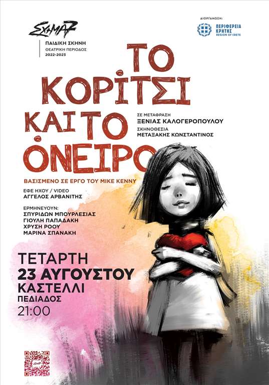 Την Τετάρτη 23 Αυγούστου και ώρα 9.00 Μ.Μ. στο Καστέλι του Δ. Μινώα Πεδιάδας, θα παρουσιαστεί η παράσταση με τίτλο “Το κορίτσι και το όνειρο”, σε σκηνοθεσία και Γενική επιμέλεια του Κωνσταντίνου Μεταξάκη, από την παιδική σκηνή του Σχήματος 7.