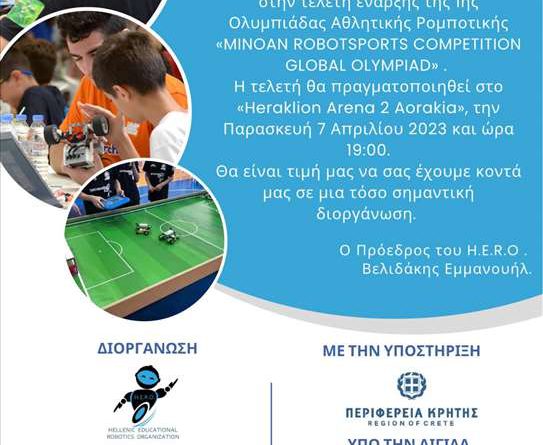 Ο Ελληνικός Οργανισμός Εκπαιδευτικής Ρομποτικής H.E.R.O. σας προσκαλεί στην τελετή έναρξης της Ολυμπιάδας Αθλητικής Ρομποτικής "Minoan Robotsports Competition Global Olympiad" η οποία θα πραγματοποιηθεί την Παρασκευή 7 Απριλίου και ώρα 7μμ στο "Heraklion Arena 2 Aorakia".