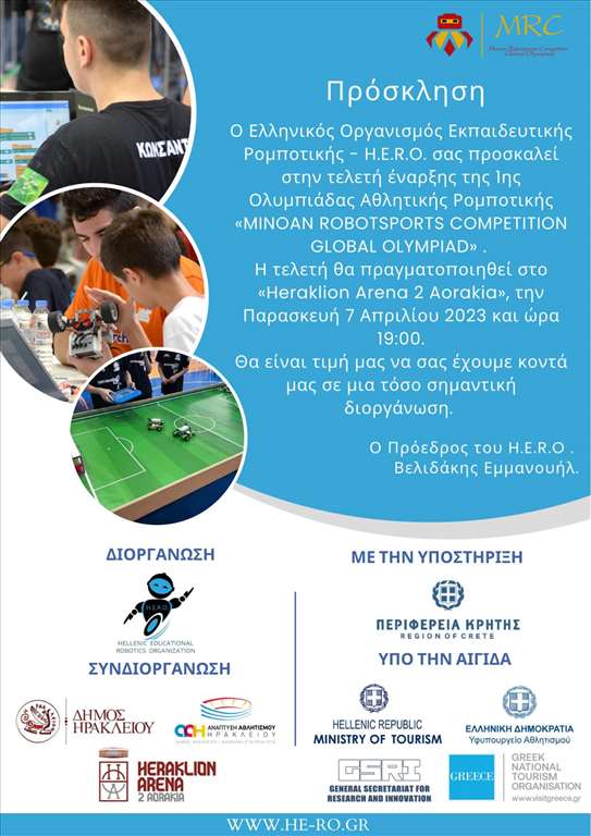 Ο Ελληνικός Οργανισμός Εκπαιδευτικής Ρομποτικής H.E.R.O. σας προσκαλεί στην τελετή έναρξης της Ολυμπιάδας Αθλητικής Ρομποτικής "Minoan Robotsports Competition Global Olympiad" η οποία θα πραγματοποιηθεί την Παρασκευή 7 Απριλίου και ώρα 7μμ στο "Heraklion Arena 2 Aorakia".