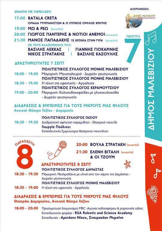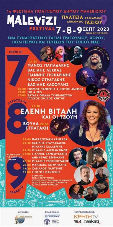 «Ξεκινά το πρώτο Malevizi Feltival. Ένας θεσμός που φιλοδοξούμε να συνδέσει τον πολιτισμό της περιοχής, τη γαστρονομία, τον πρωτογενή τομέα με τον τουρισμό σε μία τριήμερη γιορτή για μικρούς και μεγάλους στην πλατεία Κατσαμάνη στο Γάζι. Όσοι βρεθούν αυτές τις τρεις μέρες στο Γάζι θα έχουν την ευκαιρία να γευτούν και να γνωρίσουν τα προϊόντα του τόπου μας και ταυτόχρονα να απολαύσουν μουσικές παραστάσεις με σπουδαίους καλλιτέχνες και φυσικά καλλιτέχνες από όλο το Μαλεβίζι.