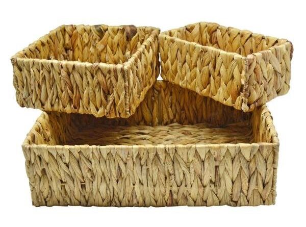 Καλάθια ψάθινα από υάκινθο, πολλαπλών χρήσεων σε διαφορετικά μεγέθη. Διαστάσεις: 20x20x8,5εκ., 20,5×11,5×8,5εκ. και 36x36x10εκ. Κυβικό ανά τεμάχιο: 0,011 Τεμάχια ανά συσκευασία: 6 Βάρος Τεμαχίου (kg): 1,183