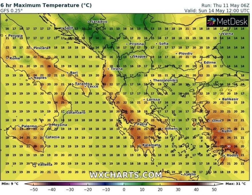 Σύμφωνα με τα τελευταία προγνωστικά μοντέλα την Κυριακή 14 Μαΐου αναμένεται να δούμε τα πρώτα 30άρια, κυρίως στη νότια Ελλάδα (Πελοπόννησος, Κυκλάδες, Δωδεκάνησα και Κρήτη), σαν μια «πρόβα» για το καλοκαίρι που έρχεται. Στην Αττική η πιο ζεστή ημέρα προβλέπεται να είναι η Κυριακή, με τον υδράργυρο, σύμφωνα με το meteo.gr, να αγγίζει στις 3 το μεσημέρι έως και τους 26 βαθμούς Κελσίου. Ενδιαφέρον παρουσιάζει η Δευτέρα 15 Μαΐου, όταν η θερμοκρασία στην πρωτεύουσα θα «χτυπήσει» κόκκινο. Ο υδράργυρος θα αγγίξει το μεσημέρι στην Αθήνα έως και τους 30 βαθμούς Κελσίου!