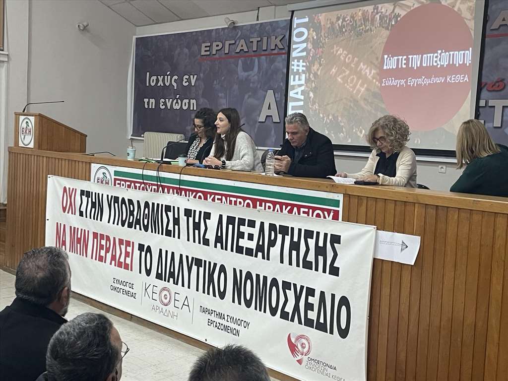 Την Τρίτη, 28/11 στο Εργατικό Κέντρο Ηρακλείου, πραγματοποιήθηκε με μεγάλη επιτυχία η σύσκεψη μαζικών φορέων που κάλεσε ο Σύλλογος Οικογένειας ΚΕΘΕΑ Αριάδνη και το παράρτημα του Συλλόγου Εργαζομένων ΚΕΘΕΑ. Στην κατάμεστη αίθουσα του Εργατικού Κέντρου εργατικά σωματεία και φορείς του νομού έδωσαν μαχητικό παρόν και δήλωσαν την αντίθεσή τους στο νέο νομοσχέδιο που ετοιμάζει το Υπουργείο Υγείας για την Ψυχιατρική Μεταρρύθμιση, μέσα στο οποίο προβλέπονται και σημαντικές αλλαγές στο πεδίο των εξαρτήσεων.