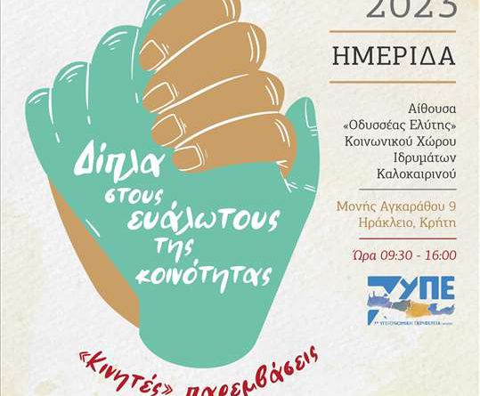 H Κινητή Μονάδα Ηρακλείου του ΚΕΘΕΑ ΑΡΙΑΔΝΗ, με τη συνεργασία και την υποστήριξη της Υγειονομικής Περιφέρειας Κρήτης, διοργανώνει ημερίδα με θέμα «Δίπλα στους ευάλωτους της κοινότητας: “Κινητές” παρεμβάσεις υποστήριξης» την Παρασκευή 10 Νοεμβρίου 2023, 09:30 -16:00 στην αίθουσα «Οδυσσέας Ελύτης» του Κοινωνικού Χώρου των Ιδρυμάτων Καλοκαιρινού (Μονής Αγκαράθου 9, Ηράκλειο).
