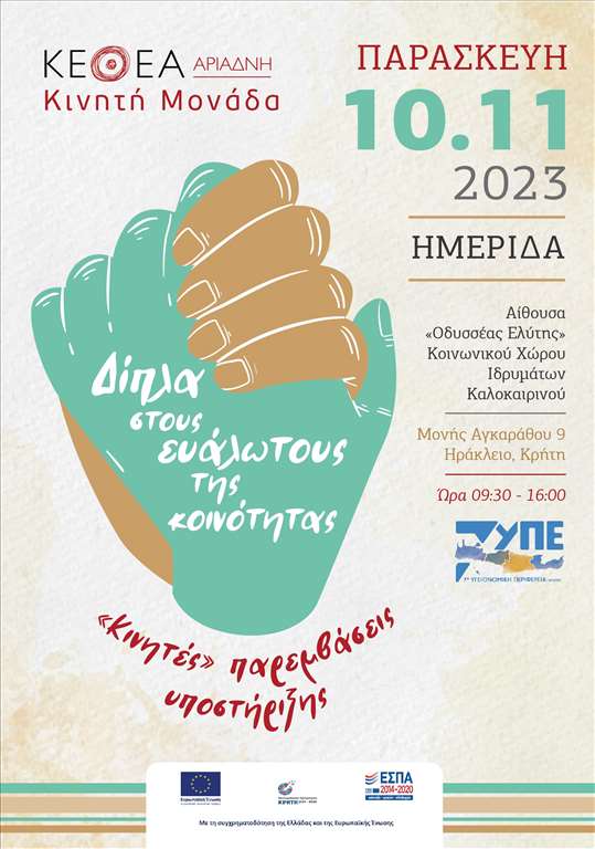 H Κινητή Μονάδα Ηρακλείου του ΚΕΘΕΑ ΑΡΙΑΔΝΗ, με τη συνεργασία και την υποστήριξη της Υγειονομικής Περιφέρειας Κρήτης, διοργανώνει ημερίδα με θέμα «Δίπλα στους ευάλωτους της κοινότητας: “Κινητές” παρεμβάσεις υποστήριξης» την Παρασκευή 10 Νοεμβρίου 2023, 09:30 -16:00 στην αίθουσα «Οδυσσέας Ελύτης» του Κοινωνικού Χώρου των Ιδρυμάτων Καλοκαιρινού (Μονής Αγκαράθου 9, Ηράκλειο).