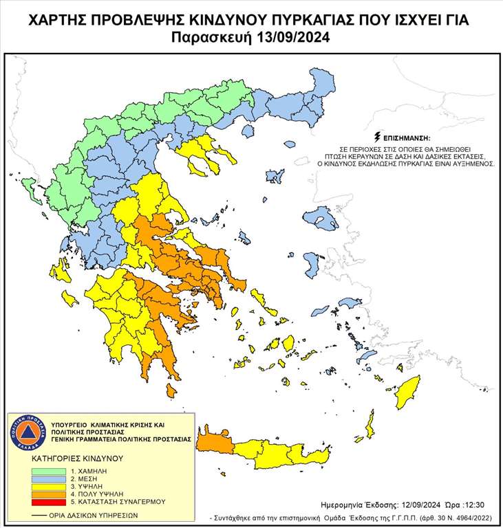 Η Πολιτική Προστασία Περιφέρειας Κρήτης ενημερώνει ότι, σύμφωνα με τον ημερήσιο Χάρτη Πρόβλεψης Κινδύνου Πυρκαγιάς της Γενικής Γραμματείας Πολιτικής Προστασίας για αύριο Παρασκευή 13η Σεπτεμβρίου 2024 η κατηγορία Κινδύνου Πυρκαγιάς για την Π.Ε. Χανίων, είναι κατηγορίας κινδύνου 4 (πολύ υψηλός).