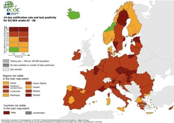 Υπενθυμίζεται ότι οι χάρτες του ECDC ανανεώνονται κάθε Πέμπτη, σύμφωνα με τη Σύσταση του Ευρωπαϊκού Συμβουλίου που έχει ως στόχο την εφαρμογή μιας συντονισμένης προσέγγισης μεταξύ των χωρών της ΕΕ όσον αφορά τον περιορισμό της ελεύθερης κυκλοφορίας για την αντιμετώπιση της πανδημίας.