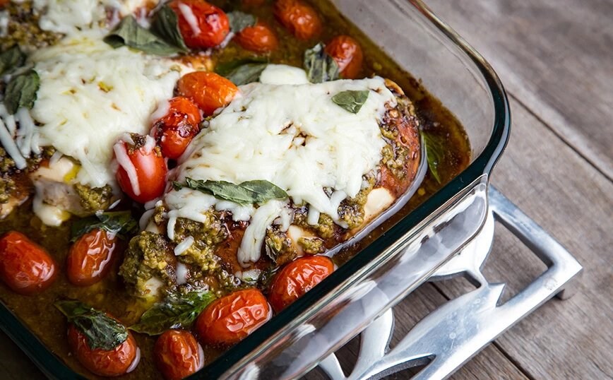 Τοποθετήστε τα ντοματίνια πάνω από το κοτόπουλο και σερβίρετε.