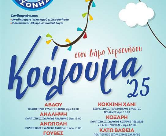 Με δωρεάν σαρακοστιανά εδέσματα και πέταγμα χαρταετού σε Ανάληψη, Αβδού, Ανώπολη, Γούβες, Γωνιές, Ελιά, Καρτερό, Κοκκίνη Χάνι, Κόξαρη, Κάτω Βάθεια, Πάνω Βάθεια, Σκοτεινό και Σταλίδα θα γιορτάσουν δημότες και επισκέπτες τα Κούλουμα την Καθαρά Δευτέρα στον Δήμο Χερσονήσου. Η Αντιδημαρχία Πολιτισμού και οι Πολιτιστικοί Σϋλλογοι της περιοχής συνδιοργανώνουν τα Κούλουμα και υπόσχονται πλούσιο πρόγραμμα για μικρούς και μεγάλους.