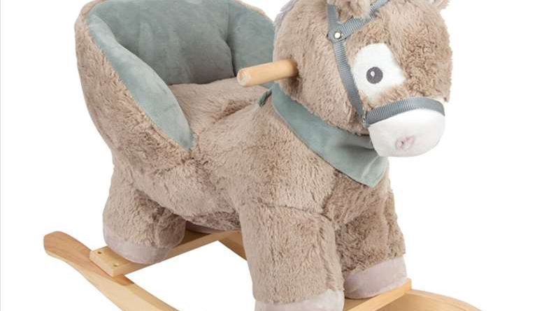 Ξύλινο κουνιστό γαϊδουράκι σε μπεζ χρώμα με χειρολαβές και σέλα με μαξιλαράκι και πλάτη, ντυμένο με λούτρινο, μαλακό ύφασμα. Μέγιστο βάρος 30kg