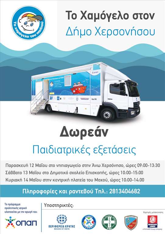 Από την Παρασκευή 12 Μαΐου 2023 έως και την Κυριακή 14 Μαΐου 2023, στο πλαίσιο της Δράσης Προληπτικής Ιατρικής / Οδοντιατρικής «ΙΠΠΟΚΡΑΤΗΣ» που υλοποιεί ο Οργανισμός «Το Χαμόγελο του Παιδιού» από το 2002, θα πραγματοποιηθούν δωρεάν προληπτικές παιδιατρικές εξετάσεις σε παιδιά/μαθητές του Δήμου Χερσονήσου.