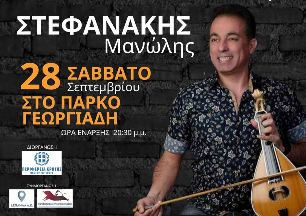 Το Σάββατο 28 Σεπτεμβρίου ο πολιτιστικός Σύλλογος Κνωσού, διοργανώνει Κρητική βραδιά με τον Μανώλη Στεφανάκη στο Πάρκο Γεωργιάδη στο Ηράκλειο.