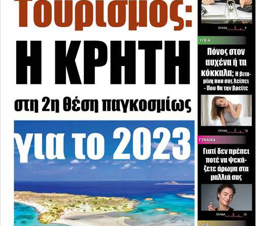 Κυκλοφορεί σήμερα Δευτέρα 9/1/2023 η εβδομαδιαία έντυπη έκδοση της εφημερίδας ΤΥΠΟΣ ΚΡΗΤΗΣ. Δείτε το πρωτοσέλιδο!!!