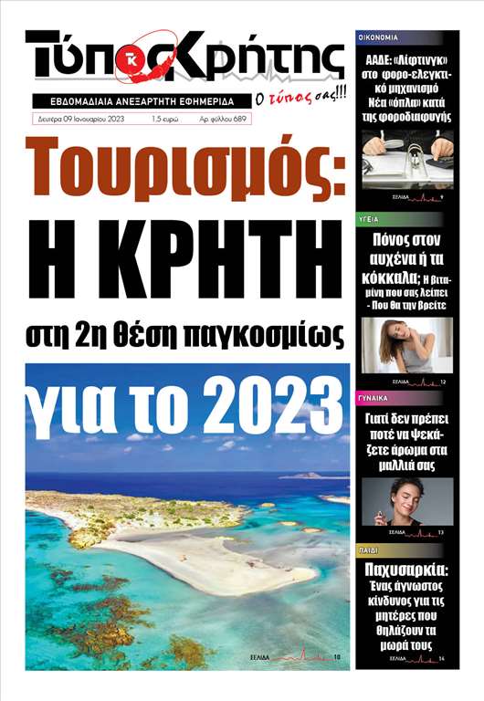 Κυκλοφορεί σήμερα Δευτέρα 9/1/2023 η εβδομαδιαία έντυπη έκδοση 689 της εφημερίδας ΤΥΠΟΣ ΚΡΗΤΗΣ.
