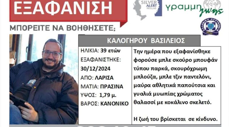 Άκαρπες για ακόμη μια μέρα ήταν οι έρευνες στον Πηνειό για τον εντοπισμό του 39χρονου Βασίλη Καλογήρου, τα ίχνη του οποίου χάθηκαν στις 30 Δεκεμβρίου στη Λάρισα. Σημειώνεται πως ο Βασίλης Καλογήρου, ψυχολόγος σε σχολείο της Καστοριάς, εξαφανίστηκε στις 30 Δεκεμβρίου από τη Λάρισα όταν βγήκε για μια βόλτα στην περιοχή του Πηνειού. Έφυγε χωρίς να πάρει μαζί του το κινητό τηλέφωνό του ή το αυτοκίνητό του. Σύμφωνα με την οικογένειά του δεν αντιμετωπίζει προβλήματα σωματικά ή ψυχολογικά.