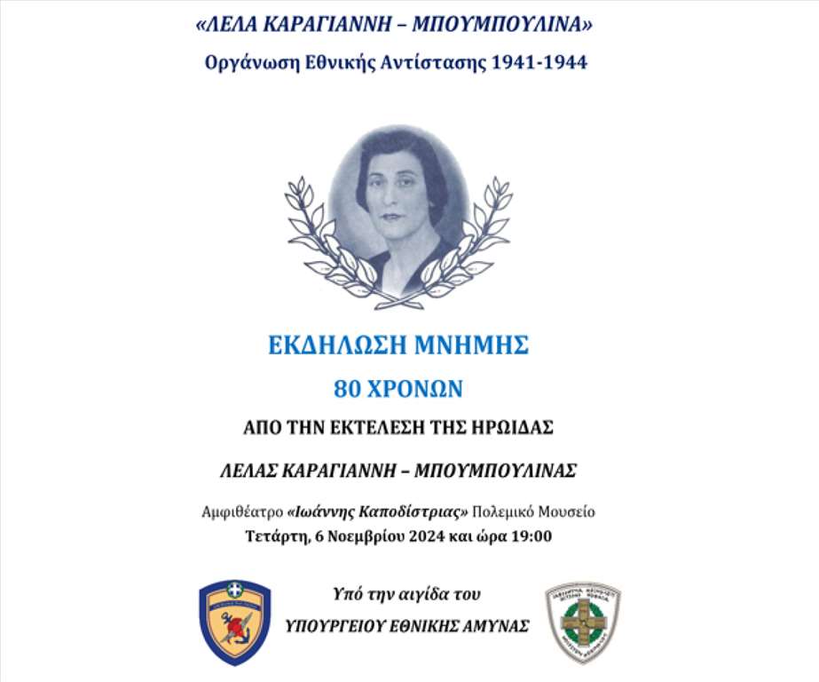Η Πρόεδρος κα Λέλα Βύρωνος Καραγιάννη, το ΔΣ και τα μέλη της Οργάνωσης Εθνικής Αντίστασης 1941-1944 «ΛΕΛΑ ΚΑΡΑΓΙΑΝΝΗ – ΜΠΟΥΜΠΟΥΛΙΝΑ» απευθύνουν πρόσκληση προσκαλούν στην επετειακή εκδήλωση μνήμης και τιμής των 80 χρόνων από την εκτέλεση της ηρωίδας της Εθνικής Αντίστασης και Ταξιάρχου επί Τιμή Λέλας Καραγιάννη, από τα γερμανικά ναζιστικά στρατεύματα κατοχής, η οποία πραγματοποιείται υπό την Αιγίδα του Υπουργείου Εθνικής Άμυνας, την Τετάρτη 6η Νοεμβρίου 2024 και ώρα 19:00, στο Αμφιθέατρο "Ιωάννης Καποδίστριας" του Πολεμικού Μουσείου.
