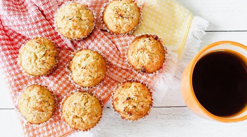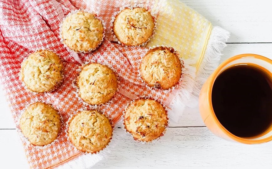Μοιράστε το μείγμα ομοιόμορφα στις θήκες για μάφιν (1/4 φλιτζάνι μείγμα σε κάθε θήκη) και πασπαλίστε τις κορυφές των μάφιν με το υπόλοιπο 1/4 φλιτζανιού τριμμένη καρύδα. Πασπαλίστε τις κορυφές με την ακατέργαστη ζάχαρη.