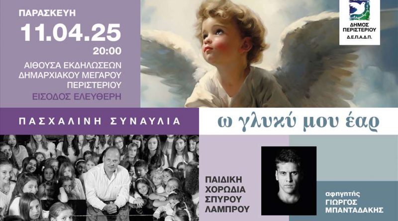 Ο Δήμαρχος Περιστερίου Ανδρέας Π. Παχατουρίδης, με ιδιαίτερη συγκίνηση και χαρά, σας προσκαλεί στη μεγάλη Πασχαλινή Χορωδιακή Συναυλία, την Παρασκευή 11 Απριλίου 2025 και ώρα 20.00, στο αμφιθέατρο του Δημαρχιακού Μεγάρου – στάση Μετρό «Περιστέρι». Η είσοδος είναι ελεύθερη!