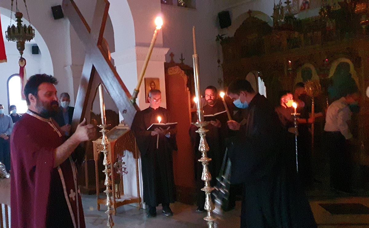 «Σήμερον κρεμάται επί ξύλου ο εν ύδασι την γην κρεμάσας» ψάλλει ο ιερέας πατέρας Νικόλαος την ώρα που περιφέρει τον εσταυρωμένο Ιησού στον ναό για την αναπαράσταση της σταύρωσης.