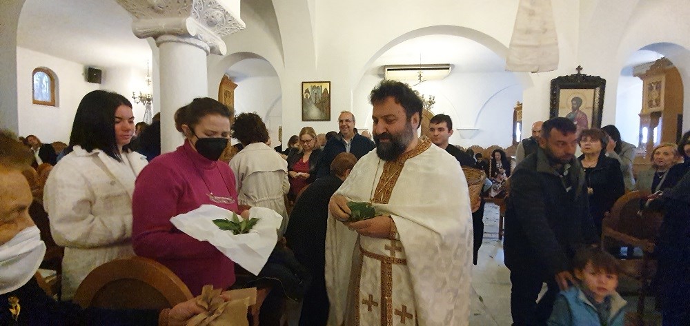 «Ανάστα ο Θεός, κρίνον τήν γην, ότι σύ κατακληρονομήσεις εν πάσι τοις εθνέσι» έψαλε ο ιερέας π. Νικόλαος Χουδετσανάκης όπου σκόρπισε σε όλο το ναό και μοίρασε στους πιστούς δαφνόφυλλα, σύμβολα της νίκης του Χριστού.
