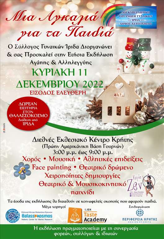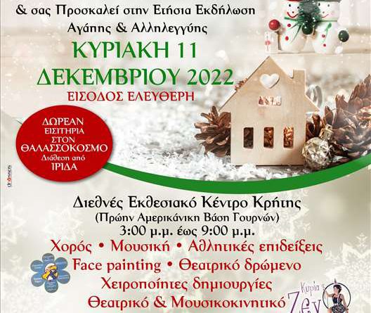 Πολλές εκπλήξεις περιμένουν μικρούς και μεγάλους σε μεγάλη εκδήλωση που διοργανώνεται την Κυριακή 11 Δεκεμβρίου, 2022 στο Διεθνές Εκθεσιακό Κέντρο Κρήτης στη Πρώην Αμερικανική Βάση Γουρνών από το Σύλλογο Γυναικών Ίριδα Δήμου Χερσονήσου.