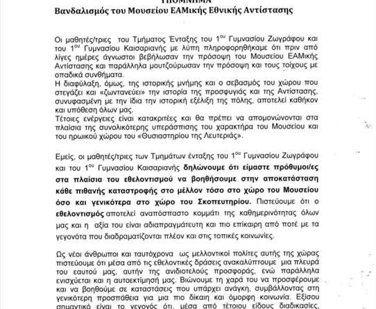 Κατά την πρόσφατη επίσκεψή τους στο Μουσείο ΕΑΜικής Αντίστασης, οι μαθητές και οι μαθήτριες , κατέθεσαν υπόμνημα με το οποίο καταδικάζουν την πρόσφατη ενέργεια βανδαλισμού στην πρόσοψη του κτιρίου, ενώ δηλώνουν την ετοιμότητά τους να βοηθήσουν στην αποκατάσταση κάθε πιθανής καταστροφής στο μέλλον αλλά και στην ολοκλήρωση κάθε έργου βελτίωσης των υποδομών του Σκοπευτηρίου.