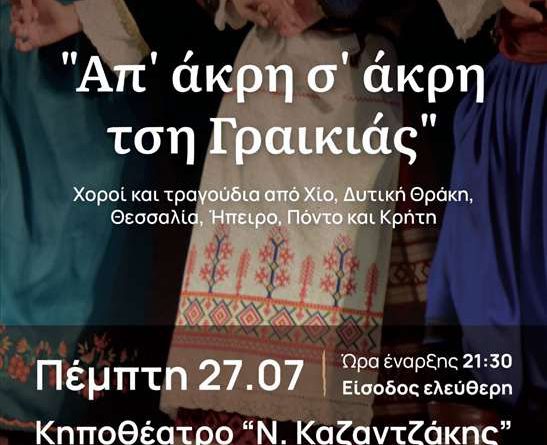 Την Πέμπτη 27 Ιουλίου στις 9.30 μ.μ. στο Κηποθέατρο Νίκος Καζαντζάκης στο Ηράκλειο, ο Σύλλογος διάδοσης ελληνικών παραδοσιακών χορών και μουσικής «Παραδοσιακό Εργαστήρι Χορού» στα πλαίσια των πολιτιστικών εκδηλώσεων του Δήμου Ηρακλείου για το καλοκαίρι του 2023, θα παρουσιάσει μία μοναδική παράσταση. Είναι μια διοργάνωση της Περιφέρειας Κρήτης με την υποστήριξη του Δήμου Ηρακλείου και της ΔΗΚΕΗ και η είσοδος είναι ελεύθερη για το κοινό.