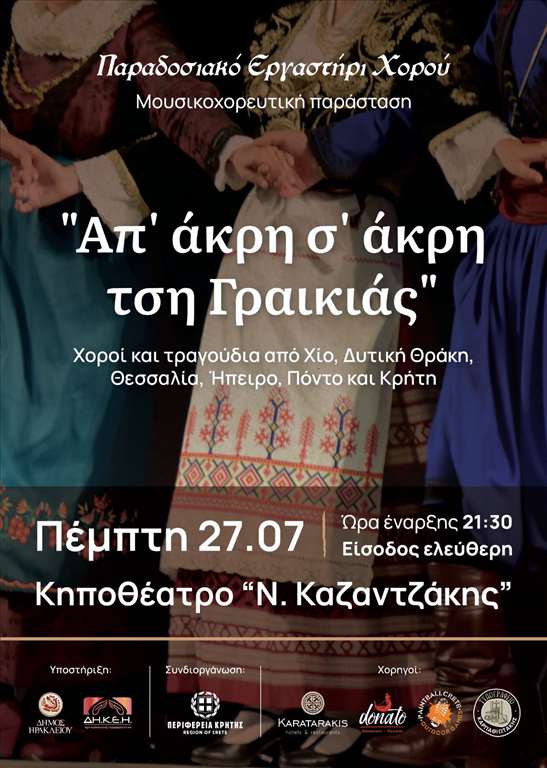Την Πέμπτη 27 Ιουλίου στις 9.30 μ.μ. στο Κηποθέατρο Νίκος Καζαντζάκης στο Ηράκλειο, ο Σύλλογος διάδοσης ελληνικών παραδοσιακών χορών και μουσικής «Παραδοσιακό Εργαστήρι Χορού» στα πλαίσια των πολιτιστικών εκδηλώσεων του Δήμου Ηρακλείου για το καλοκαίρι του 2023, θα παρουσιάσει μία μοναδική παράσταση. Είναι μια διοργάνωση της Περιφέρειας Κρήτης με την υποστήριξη του Δήμου Ηρακλείου και της ΔΗΚΕΗ και η είσοδος είναι ελεύθερη για το κοινό.