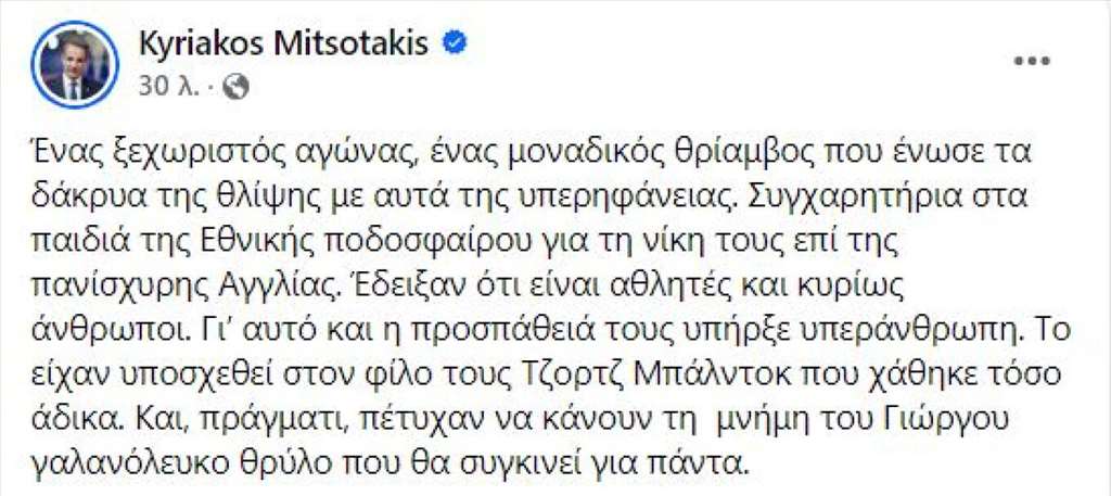 Ως έναν «μοναδικό θρίαμβο που ένωσε τα δάκρυα της θλίψης με αυτά της υπερηφάνειας» χαρακτήρισε ο πρωθυπουργός Κυριάκος Μητσοτάκης την νίκη της Εθνικής Ελλάδος επί της Αγγλίας το βράδυ της Πέμπτης στο Γουέμπλεϊ για το Nations League.