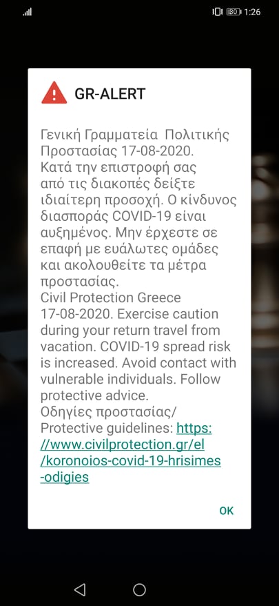 Η αποστολή του μηνύματος απο το 112 έχει ήδη ξεκινήσει και αναφέρει: «Γενική Γραμματεία Πολιτικής Προστασίας 17-08-2020. Κατά την επιστροφή σας από τις διακοπές δείξτε ιδιαίτερη προσοχή. Ο κίνδυνος διασποράς COVID-19 είναι αυξημένος, Μην έρχεστε σε επαφή με ευάλωτες ομάδες και ακολουθείτε τα μέτρα προστασίας».