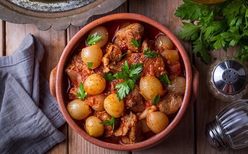 Αφού το μοσχάρι σιγοβράσει για μία ώρα, προσθέστε τα κρεμμύδια, ανακατέψτε και συνεχίστε το σιγοβράσιμο για 20 λεπτά.