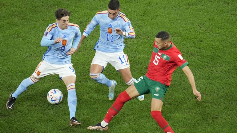 Το πρώτο ημίχρονο ήταν ισορροπημένο δίχως πολλές και μεγάλες φάσεις. Οι Μαροκινοί ωστόσο έδειξαν να πηγαίνουν το παιχνίδι εκεί που ήθελαν. Και γενικώς πατούσαν καλύτερα στο γήπεδο καθώς το παιχνίδι τους έβγαινε βάσει σχεδιασμού. Αντιθέτως, οι Ισπανοί δεν μπόρεσαν να επιβάλουν τον ρυθμό τους, ούτε και να κυκλοφορήσουν την μπάλα όπως θα ήθελαν με αποτέλεσμα να μην γίνουν απειλητικοί.