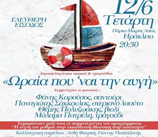 Μουσική εκδήλωση ευαισθητοποίησης κατά της βίας με τίτλο »Ωραία που’ ναι την αυγή» θα πραγματοποιηθεί την Τετάρτη 12 Ιουνίου στις 20:30 στο Πάρκο Μικράς Ασίας από τους συμμετέχοντες του προγράμματος »Η τέχνη του ρυθμού στην εκπαίδευση – Μουσική στην κοινότητα» του Δήμου Ηρακλείου, που υλοποιεί το Εργαστήρι Θεάτρου-Κινηματογράφου-Μουσικής του Πανεπιστημίου Κρήτης, σε συνεργασία με τον Δήμο Ηρακλείου, την Αντιδημαρχία Πολιτισμού Ηρακλείου και την 4η Δημοτική Κοινότητα Ηρακλείου.