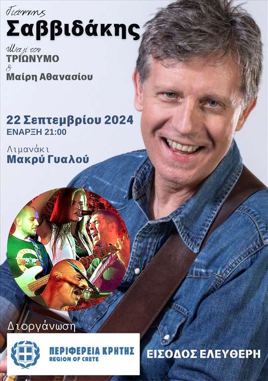 Μουσική εκδήλωση με τον Γιάννη Σαββιδάκη και την στήριξη της Περιφέρειας Κρήτης θα πραγματοποιηθεί το Σάββατο 22 Σεπτεμβρίου στο Μακρύ Γυαλό .