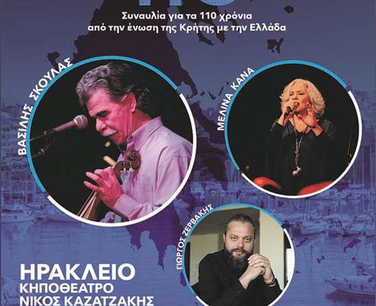 Την Τετάρτη 2 Αυγούστου στις 9:00 μ.μ. στο Κηποθέατρο του Δήμου Ηρακλεί-ου, «Νίκος Καζαντζάκης» θα παρουσιαστεί μια μεγάλη συναυλία-ύμνο στην ομορφιά και τη γενναιότητα της κρητικής ψυχής, με την οποία θα εορτασθεί η συμπλήρωση 110 χρόνων από την Ένωση της Κρήτης με την Ελλάδα.