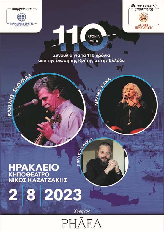 Την Τετάρτη 2 Αυγούστου στις 9:00 μ.μ. στο Κηποθέατρο του Δήμου Ηρακλεί-ου, «Νίκος Καζαντζάκης» θα παρουσιαστεί μια μεγάλη συναυλία-ύμνο στην ομορφιά και τη γενναιότητα της κρητικής ψυχής, με την οποία θα εορτασθεί η συμπλήρωση 110 χρόνων από την Ένωση της Κρήτης με την Ελλάδα.
