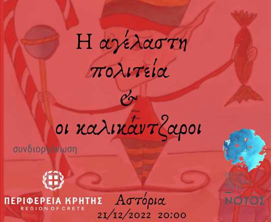 Την Τετάρτη 21 Δεκεμβρίου 2022 στο κινηματοθέατρο «Αστόρια» και ώρα 20:00 η Ανώτερη Σχολή Δραματικής Τέχνης «Νότος» σε συνδιοργάνωση με την Περιφέρεια Κρήτης παρουσιάζουν τη μουσικοθεατρική παράσταση «Η αγέλαστη πολιτεία και οι καλικάντζαροι» των αδελφών Κατσιμίχα.