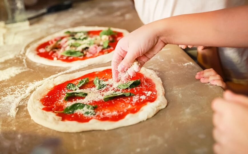 Χωρίστε τη ζύμη στη μέση και σχηματίστε κάθε μισό σε μπάλα. Τοποθετήστε κάθε μισό σε ένα μπολ που έχει λαδωθεί και καλύψτε το με διάφανη μεμβράνη για 45 λεπτά σε θερμοκρασία δωματίου. Προθερμάνετε το φούρνο στους 250 βαθμούς.