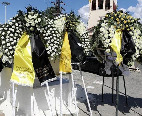 Η νεκροφόρα που μετέφερε τη σορό του 29χρονου φέρει κιτρινόμαυρες κορδέλες, ενώ το φέρετρο ήταν στολισμένο με κίτρινα τριαντάφυλλα και ένα κασκόλ της ΑΕΚ που γράφει Original.