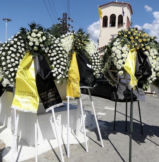 Η νεκροφόρα που μετέφερε τη σορό του 29χρονου φέρει κιτρινόμαυρες κορδέλες, ενώ το φέρετρο ήταν στολισμένο με κίτρινα τριαντάφυλλα και ένα κασκόλ της ΑΕΚ που γράφει Original.