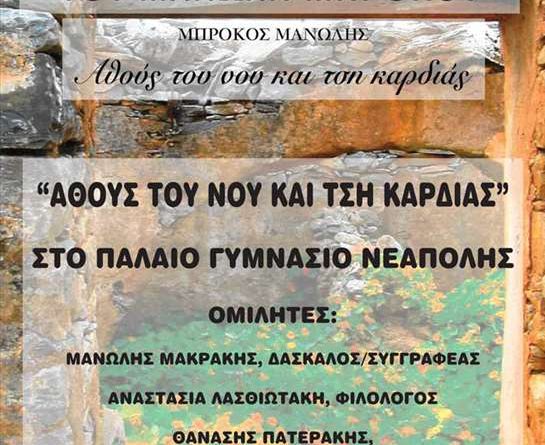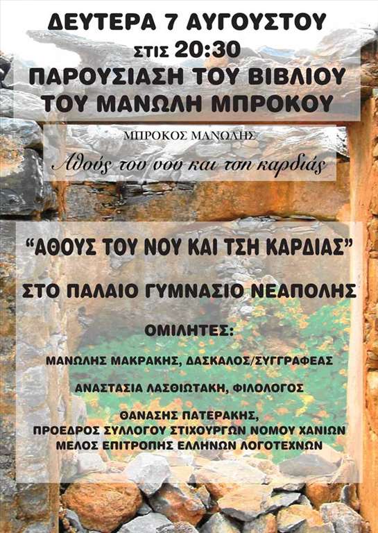 Την Δευτέρα 7 Αυγούστου στο χώρο του Λαογραφικού Μουσείου Νεάπολης με την υποστήριξη της Κοινότητας Νεάπολης θα γίνει παρουσίαση βιβλίου με ποιήματα του κ. Μανόλη Μπρόκου.