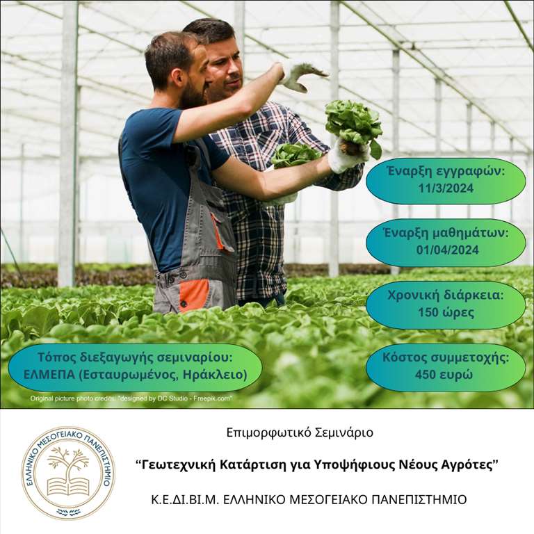 To Κέντρο Επιμόρφωσης & Διά Βίου Μάθησης (Κ.Ε.ΔΙ.ΒΙ.Μ.) του Ελληνικού Μεσογειακού Πανεπιστημίου (ΕΛΜΕΠΑ), ανακοινώνει τη δημιουργία ενός νέου Προγράμματος Κατάρτισης με τίτλο «Γεωτεχνική Κατάρτιση για Υποψήφιους Νέους Αγρότες».