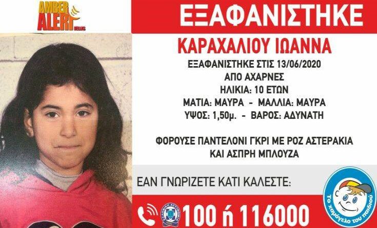 Σύμφωνα με το «Χαμόγελο του Παιδιού», το απόγευμα του Σαββάτου η Ιωάννα Καραχάλιου εξαφανίστηκε από την περιοχή των Αχαρνών Αττικής.